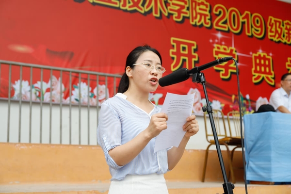 典禮上,教師代表李敏、老生代表經(jīng)濟(jì)貿(mào)易系朱浩、新生代表電子信息系李昆先后發(fā)言。(文/桂駿)