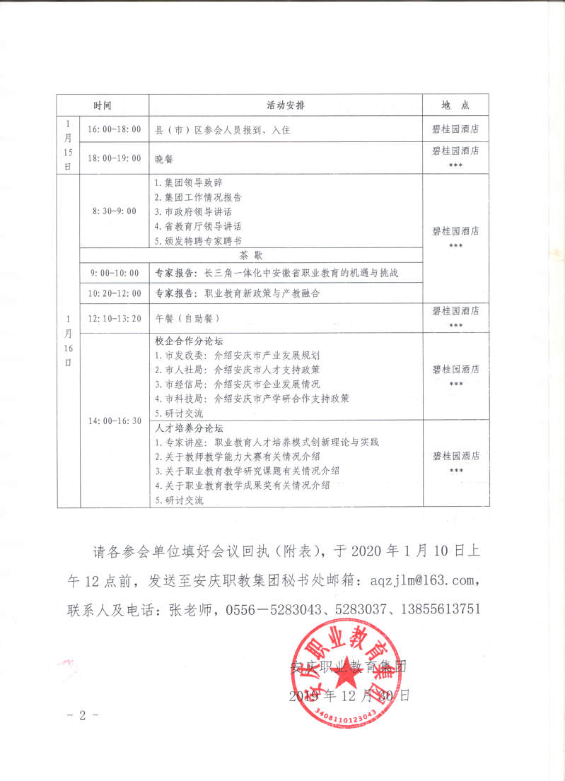 安慶職教集團(tuán)擬定于2020年1月16日召開集團(tuán)年會(huì)暨高質(zhì)量發(fā)展論壇,請(qǐng)各參會(huì)單位填好會(huì)議回執(zhí)(附表),于2020年1月10日上午12點(diǎn)前,發(fā)送至安慶職教集團(tuán)秘書處郵箱:aqzjlm@163.com。參會(huì)回執(zhí)見附件2。