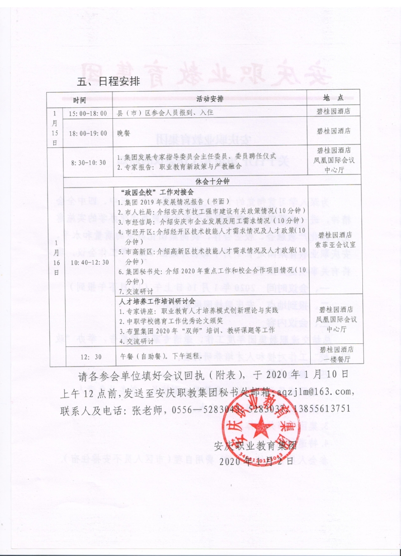 安慶職教集團擬定于2020年1月16日召開集團2020年工作會議,請各參會單位填好會議回執(zhí)(附表),于2020年1月10日上午12點前,發(fā)送至安慶職教集團秘書處郵箱:aqzjlm@163.com。參會回執(zhí)見附件2。