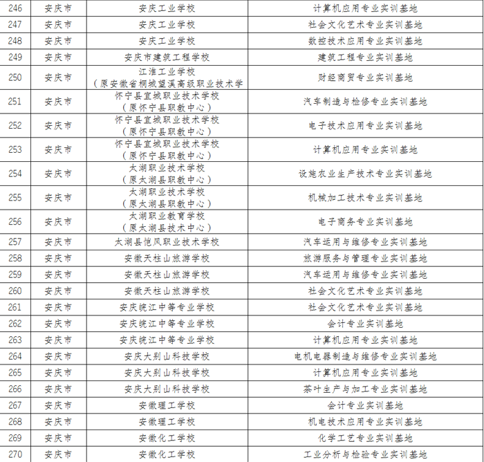 根據(jù)《安徽省教育廳安徽省人力資源和社會(huì)保障廳關(guān)于公布安徽省中等職業(yè)教育質(zhì)量提升工程項(xiàng)目驗(yàn)收結(jié)果暨省級(jí)示范中等職業(yè)學(xué)校等認(rèn)定申請(qǐng)的通知》有關(guān)精神,在各市申報(bào)、專家評(píng)議基礎(chǔ)上,省教育廳研究決定將130所中等職業(yè)學(xué)校的282個(gè)實(shí)訓(xùn)基地列入省級(jí)示范實(shí)訓(xùn)基地重點(diǎn)建設(shè)實(shí)訓(xùn)基地,其中包括安慶職業(yè)教育集團(tuán)10所學(xué)校的24個(gè)實(shí)訓(xùn)基地。
