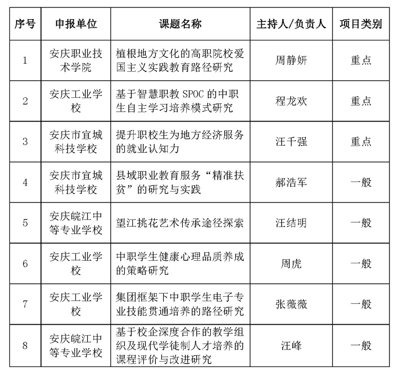 根據(jù)《安慶職業(yè)教育集團(tuán)關(guān)于做好2020年教學(xué)改革研究課題申報(bào)工作的通知》文件精神,經(jīng)個(gè)人申報(bào)、學(xué)校推薦,集團(tuán)秘書處按照相關(guān)程序組織形式審查、專家評(píng)審,現(xiàn)對(duì)集團(tuán)2020年教學(xué)改革研究課題擬立項(xiàng)名單進(jìn)行公示。