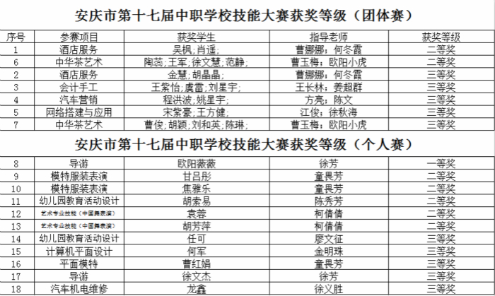 近日,安慶市第十七屆中職學(xué)校技能大賽成績揭曉,安慶皖江中等專業(yè)學(xué)校再獲佳績,共有12 項 30人次獲獎,其中一等獎1個1人次,二等獎7個11人次,三等獎10個18人次,獲獎率達(dá)78.95%。