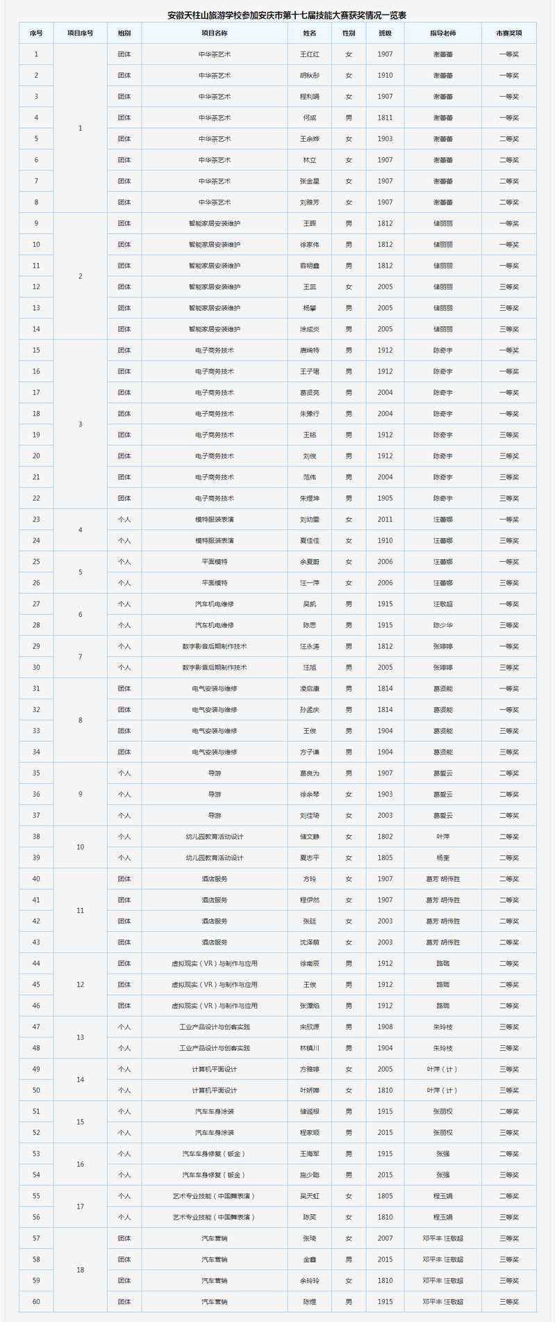 近日,安慶市第十七屆中職學(xué)校技能大賽成績揭曉,安徽天柱山旅游學(xué)校再創(chuàng)佳績,共有18 項(xiàng) 60 人次獲獎,其中一等獎8個17人次,二等獎12個19人次,三等獎16個24人次。一等獎獲獎項(xiàng)目占總賽項(xiàng)近三分之一。