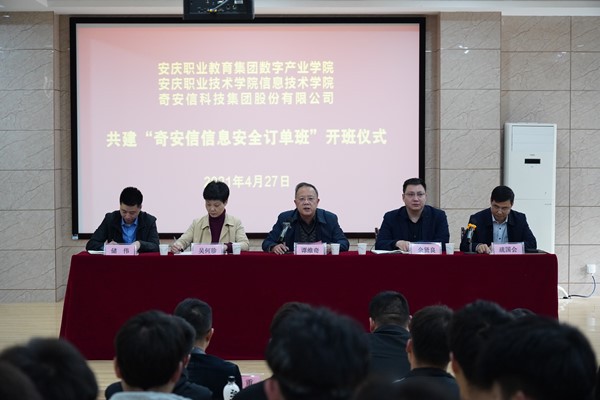 4月27日下午,由安慶職教集團數(shù)字產(chǎn)業(yè)學(xué)院、安慶職業(yè)技術(shù)學(xué)院信息技術(shù)學(xué)院與奇安信科技集團股份有限公司合作共建的數(shù)字產(chǎn)業(yè)學(xué)院首屆“奇安信信息安全訂單班”開班典禮在2號教學(xué)樓216教室隆重舉行。