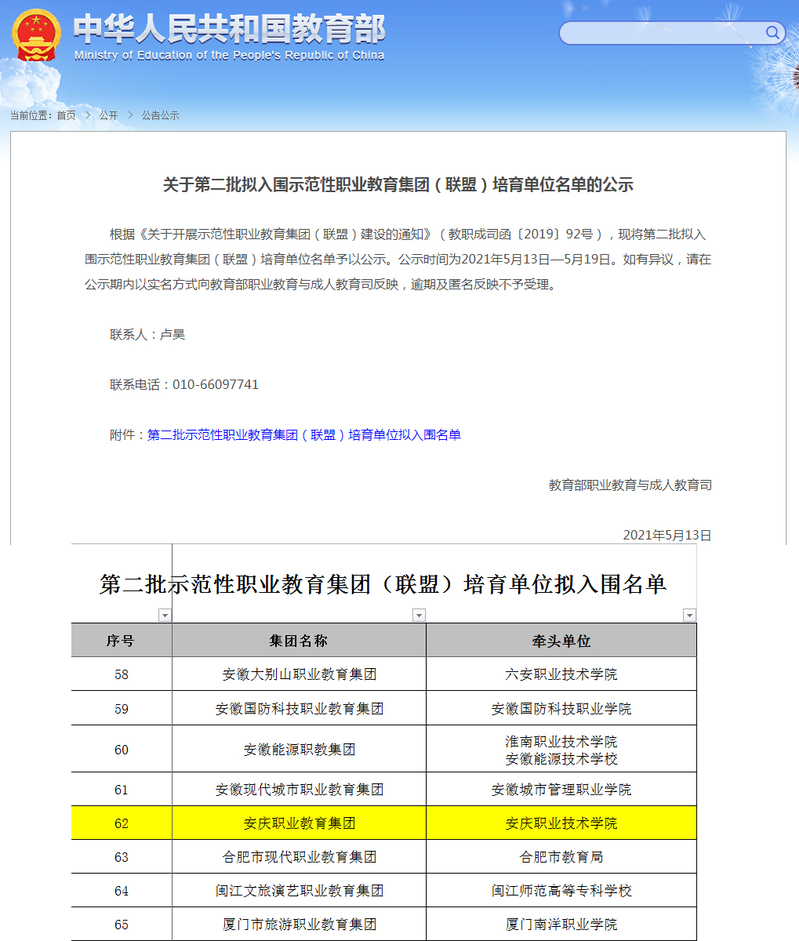 5月13日,教育部職業(yè)教育與成人教育司公示了第二批擬入圍示范性職業(yè)教育集團(tuán)(聯(lián)盟)培育單位名單,安慶職業(yè)教育集團(tuán)榜上有名。