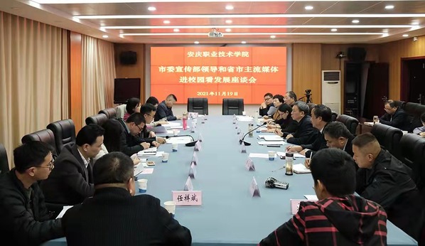 11月19日下午,安慶市市委宣傳部副部長(zhǎng)查文平,市融媒體中心黨委委員、副主任陳慶玲以及安徽日?qǐng)?bào)、安徽廣播電視臺(tái)、安徽經(jīng)濟(jì)報(bào)、安徽法制報(bào)、市場(chǎng)星報(bào)、安徽商報(bào)、皖江晚報(bào)、中安在線安慶頻道等省市9家主流媒體和中國(guó)網(wǎng),走進(jìn)安慶職業(yè)技術(shù)學(xué)院校園看發(fā)展,并進(jìn)行座談。校黨委書記童宏葵出席座談會(huì)并作了熱情洋溢的講話,對(duì)學(xué)校與媒體進(jìn)一步加強(qiáng)溝通交流提出要求。校黨委委員、宣傳部長(zhǎng)潘發(fā)生主持座談會(huì)。