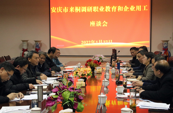 1月27日,安慶職業(yè)技術(shù)學(xué)院黨委書記童宏葵率隊(duì)調(diào)研桐城市職業(yè)教育發(fā)展情況。桐城市委副書記金秋明,桐城市人大常委會(huì)副主任、人社局局長詹向前,副市長汪杰賢,政協(xié)副主席、教育局局長劉決成,安慶市教體局副局長潘連宇、四級(jí)調(diào)研員吳宗亞,安慶職院黨委副書記李克讓及安慶職院校企合作辦、招生就業(yè)處負(fù)責(zé)同志參加調(diào)研。