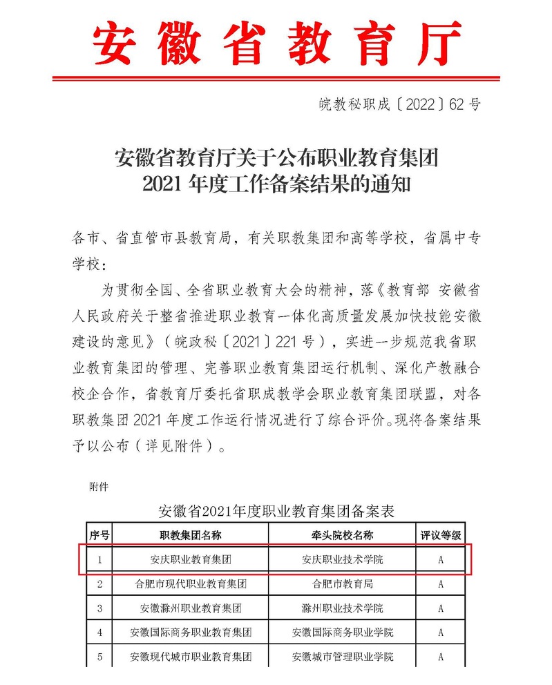 近日,省教育廳發(fā)出通報文件,安慶職教集團在全省54家職教集團2021年度工作運行情況綜合評價中,以總分第一名成績獲評安徽省A類職教集團,實現(xiàn)連續(xù)四年榮獲安徽省A類職教集團榮譽。