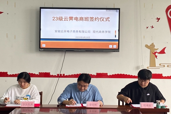 9月25日上午,安慶職業(yè)技術(shù)學(xué)院現(xiàn)代商務(wù)學(xué)院與安徽云霽電子商務(wù)有限公司舉行“23級云霽電商訂單班”簽約儀式。云霽電商公司董事長汪義德、總經(jīng)理程塞超,現(xiàn)代商務(wù)學(xué)院黨總支書記、院長金啟勝,副院長余瑰,電子商務(wù)專業(yè)建設(shè)負(fù)責(zé)人夏金弟及相關(guān)輔導(dǎo)員和學(xué)生代表等參加簽約儀式。