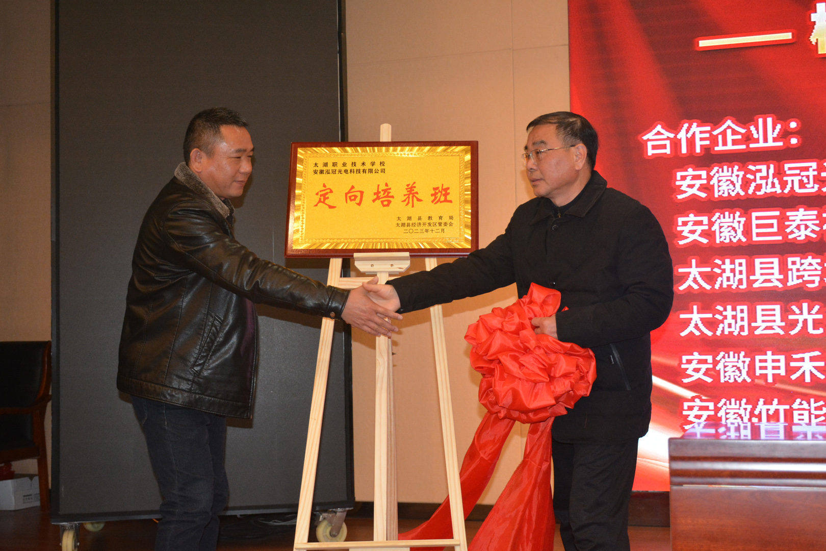 1月10日,太湖職業(yè)技術(shù)學(xué)校在學(xué)校致公樓一樓多功能廳隆重舉行校企合作簽約暨2023級(jí)“企業(yè)定向培養(yǎng)班”揭牌儀式。安徽泓冠光電科技有限公司、安徽巨泰視顯光電科技有限公司、安徽申禾智能科技有限公司、太湖縣跨境電商產(chǎn)業(yè)園、太湖縣光華鋁業(yè)有限公司、安徽竹能碳纖維材料有限公司等六家企業(yè)分別與學(xué)校成功簽訂校企合作協(xié)議,太湖縣人社局、太湖縣企業(yè)服務(wù)中心、太湖縣教育局等相關(guān)部門(mén)領(lǐng)導(dǎo)受邀出席,并與六家企業(yè)代表共同為“企業(yè)定向培養(yǎng)班”揭牌。