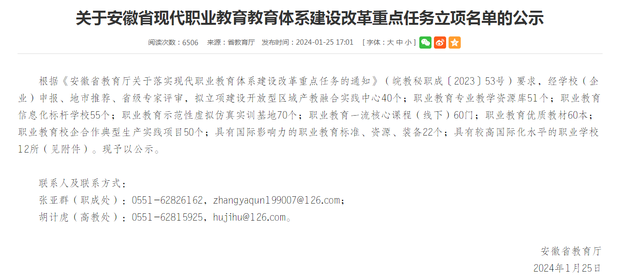 近日,安徽省教育廳發(fā)布《關于安徽省現代職業(yè)教育教育體系建設改革重點任務立項名單的公示》,集團多所院校共23個申報項目獲得立項。