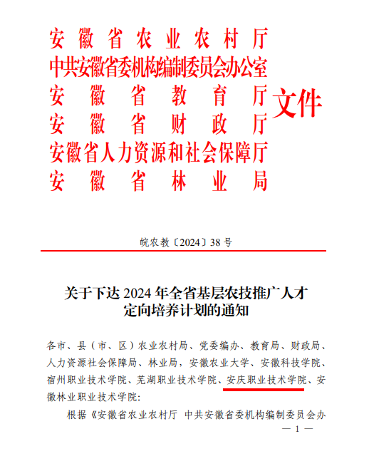 近日,安徽省農(nóng)業(yè)農(nóng)村廳等六部門聯(lián)合印發(fā)《關于下達 2024 年全省基層農(nóng)技推廣人才定向培養(yǎng)計劃的通知》,安慶職業(yè)技術學院被定為安徽省基層農(nóng)技推廣人才定向培養(yǎng)高校。