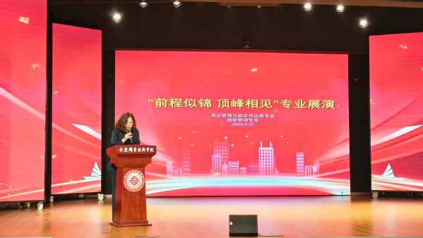 管理服務(wù)學(xué)院院長(zhǎng)陳穎致辭,代表學(xué)院師生感謝蒞臨活動(dòng)現(xiàn)場(chǎng)的企業(yè)來賓、學(xué)校相關(guān)部門等對(duì)管理服務(wù)學(xué)院專業(yè)建設(shè)、實(shí)習(xí)就業(yè)、學(xué)生成長(zhǎng)成才等各項(xiàng)工作的熱忱關(guān)心和大力支持;寄語即將走上實(shí)習(xí)就業(yè)工作崗位的2022級(jí)旅游酒店專業(yè)同學(xué),要求大家樹立正確的擇業(yè)觀和就業(yè)觀,積極轉(zhuǎn)變身份角色,盡早樹立職場(chǎng)意識(shí);堅(jiān)定信念遵守職業(yè)道德,勇敢追求人生理想;深入了解安慶歷史人文、熟悉安慶產(chǎn)業(yè)企業(yè)、關(guān)心安慶建設(shè)發(fā)展,以實(shí)際行動(dòng)助力美好安慶建設(shè);同時(shí)對(duì)2023級(jí)同學(xué)提出殷切希望,要求大一同學(xué)在校期間努力學(xué)好專業(yè)理論知識(shí)、積極提升專業(yè)操作技能、全面豐富人文道德素養(yǎng),真正踐行“勤學(xué)篤行德技雙馨”的校訓(xùn)精神。安慶會(huì)展中心會(huì)議中心酒店總經(jīng)理丁敏代表企業(yè)發(fā)言,她指出未來的企業(yè)競(jìng)爭(zhēng)是人才的競(jìng)爭(zhēng),學(xué)習(xí)能力和專業(yè)技能是高職同學(xué)們成功的核心競(jìng)爭(zhēng)力,希望同學(xué)們不斷更新知識(shí)、提高綜合素養(yǎng),志存高遠(yuǎn)腳踏實(shí)地,勇往直前未來可期。