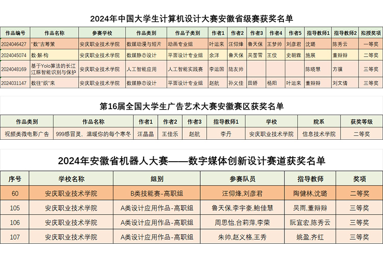 在安徽省教育廳公布的《關(guān)于公布2024年7月至8月安徽省大學(xué)生學(xué)科和技能競(jìng)賽部分賽事獲獎(jiǎng)名單的通知》中,安慶職院沈璐、陳秀云老師指導(dǎo)的葉運(yùn)來(lái)、汪仰烽、魯天保、王夢(mèng)帥、劉彥君學(xué)生團(tuán)隊(duì)獲得2024年中國(guó)大學(xué)生計(jì)算機(jī)設(shè)計(jì)大賽安徽省級(jí)賽“數(shù)媒動(dòng)漫與短片類(lèi)-動(dòng)畫(huà)專(zhuān)業(yè)組”一等獎(jiǎng);施展、董辯辯老師指導(dǎo)的余洋、魯天保、吳莟雪、王佼、史朝霖學(xué)生團(tuán)隊(duì)獲得“數(shù)媒靜態(tài)設(shè)計(jì)類(lèi)-平面設(shè)計(jì)專(zhuān)業(yè)組”二等獎(jiǎng);陳曉慧、方驥、董辯辯、劉文倩老師指導(dǎo)的學(xué)生團(tuán)隊(duì)分別獲得“人工智能應(yīng)用類(lèi)-人工智能實(shí)踐賽”和“數(shù)媒靜態(tài)設(shè)計(jì)類(lèi)-平面設(shè)計(jì)專(zhuān)業(yè)組”三等獎(jiǎng)。在第16屆全國(guó)大學(xué)生廣告藝術(shù)大賽安徽賽中,李丹老師指導(dǎo)的汪晶晶、王佳樂(lè)、趙航學(xué)生團(tuán)隊(duì)獲得“視頻類(lèi)微電影廣告”二等獎(jiǎng)。