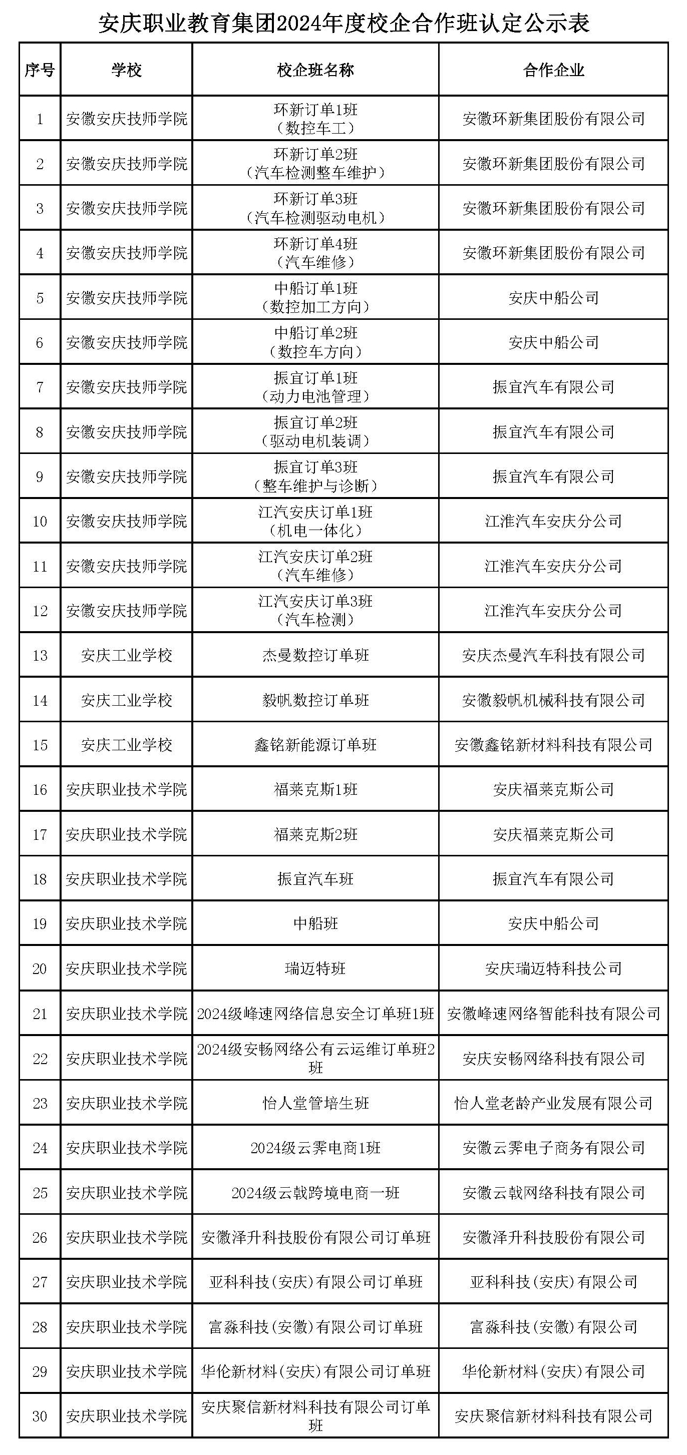 根據(jù)《關(guān)于報(bào)送招生、校企合作班項(xiàng)目獎補(bǔ)資金申報(bào)材料的通知》(安職集團(tuán)〔2024〕4號)等相關(guān)文件要求,集團(tuán)秘書處組織開展了2024年度招生、省級市域產(chǎn)教聯(lián)合體、校企合作班項(xiàng)目評審工作,制定出臺《安慶職業(yè)教育集團(tuán)2024年度招生、省級市域產(chǎn)教聯(lián)合體、校企合作班評審工作實(shí)施方案》,成立評審工作領(lǐng)導(dǎo)小組,設(shè)立評委會,遴選評審專家,并嚴(yán)格按照《關(guān)于印發(fā)〈安慶職業(yè)教育集團(tuán)財(cái)政獎補(bǔ)資金認(rèn)定管理辦法〉的通知》(教體高〔2024〕185號)文件對各校提供的項(xiàng)目申報(bào)材料進(jìn)行了評審,認(rèn)定結(jié)果現(xiàn)予公示。