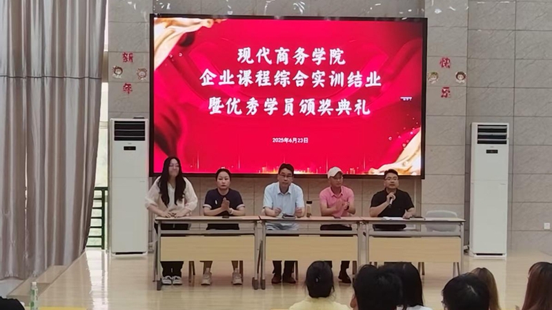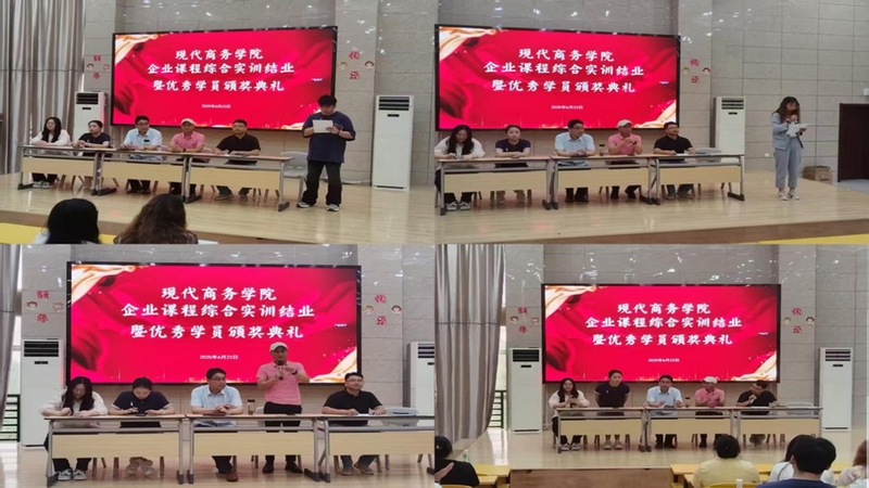 6月23日下午,安慶職業(yè)技術(shù)學(xué)院現(xiàn)代商務(wù)學(xué)院舉行上半年企業(yè)綜合實訓(xùn)課程結(jié)業(yè)暨優(yōu)秀學(xué)員頒獎典禮。現(xiàn)代商務(wù)學(xué)院院長金啟勝,安徽云霽電商公司負(fù)責(zé)人、安徽省產(chǎn)業(yè)教授汪義德,學(xué)院教學(xué)工作負(fù)責(zé)人、學(xué)生工作負(fù)責(zé)人、教師代表以及參加本次實訓(xùn)課程的全體學(xué)生共同出席。該院學(xué)生工作負(fù)責(zé)人主持。